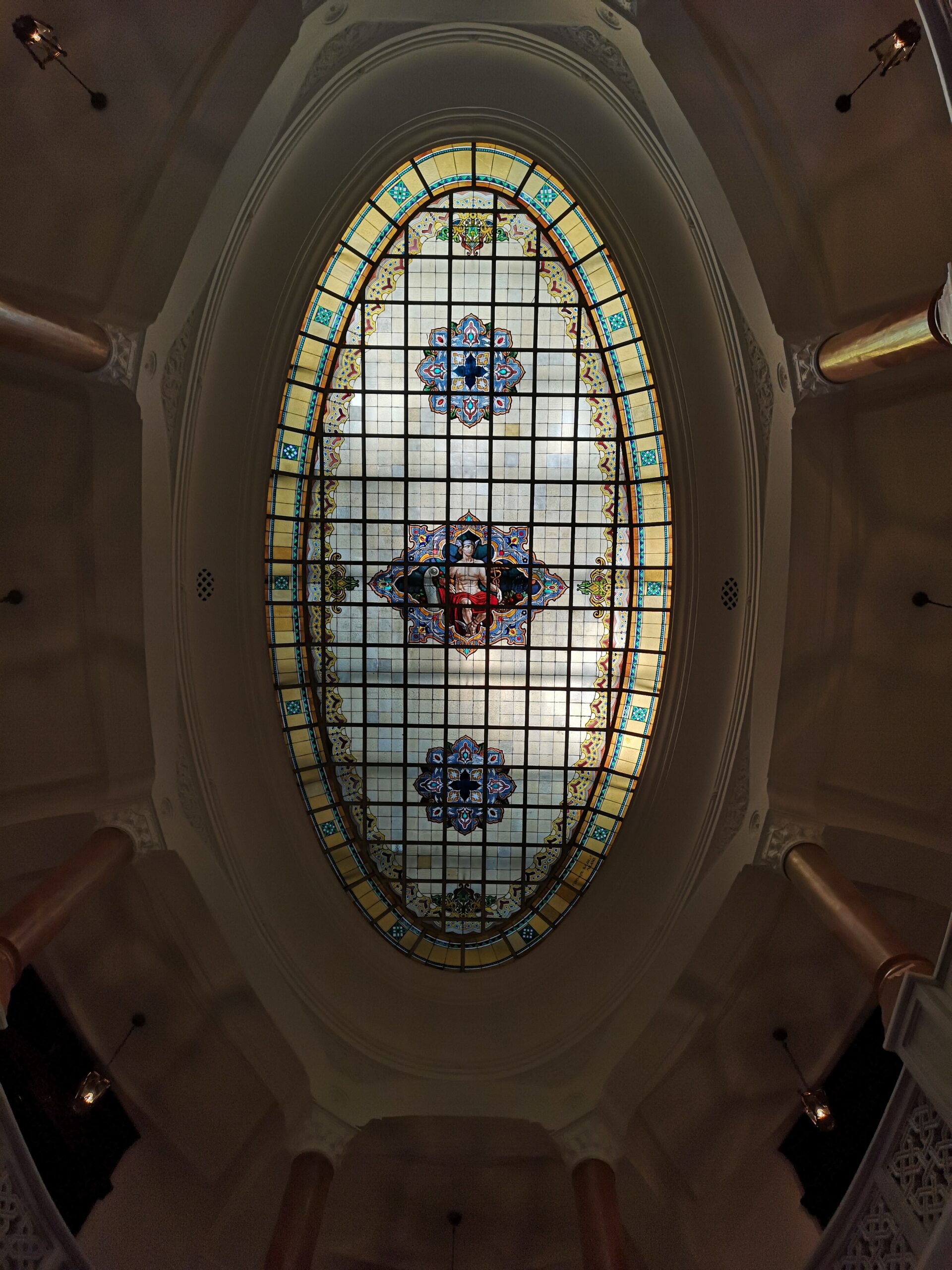 Ana holün üzerine konumlandırılmış oval biçimdeki vitray, hem holün hem de üst katın daha fazla ışık almasına yardımcı olur. Bu vitray, Türkiye Cumhuriyeti mimarisi açısından oldukça önemli ve eşine neredeyse hiç rastlanmayan bir detayla kaplıdır: Hermes tasviri. Elindeki Yunanca habercinin asası anlamına gelen, iki yılanın dolandığı ve tepesinde kanatları olan, Türkiye Cumhuriyeti Sağlık Bakanlığı’nın ve Türk Tabipler Birliği’nin logolarında da görülen Kadüse‘siyle (İng: Caduceus) Yunan tanrı Hermes betimlemesi, İş Bankası Binası’nın vitrayının merkezine yerleştirilmiştir. İtalyan sanatçılar Carlo Bazzi ve Salvatore Corvaya’nın şirketi olan “Corvaya e Bazzi” imzasıyla yapılan vitraydaki tanrıların habercisi Hermes; habercilerin, gezginlerin, tüccarların ve hatiplerin koruyucusu olarak bilinir.