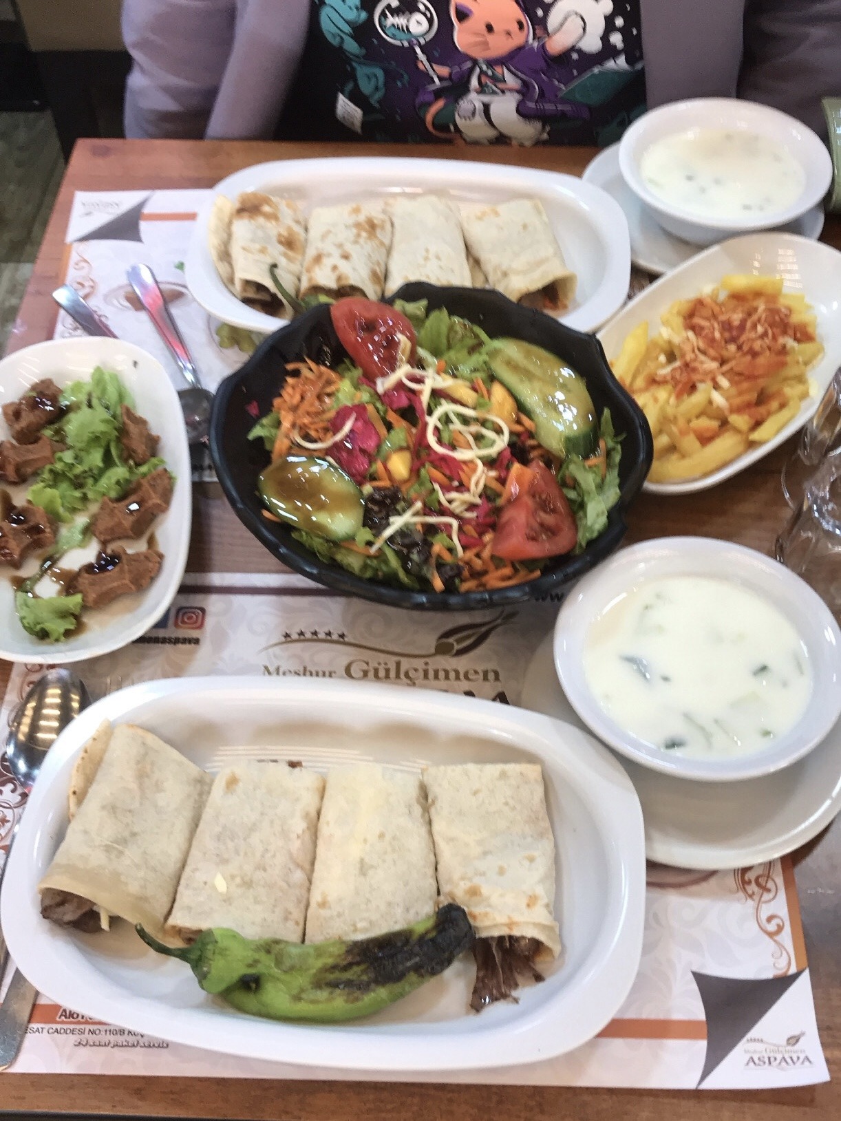 Hangi aspavanın en iyisi olduğu konusunda birçok tartışma ve söylenti olsa da, yerli bir arkadaşımızın tavsiyesiyle Esat üzerindeki Gülçimen Aspava‘yı tercih ettik. Ne yiyeceğimiz konusunda kafamız karışık olsa da SSK (Sarımsaklı Soslu Kaşarlı) yemeyi tercih ettik. Yanında ikram olarak mevsim salata, cacık, kaşarlı soslu patates kızartması, çiğköfte geliyor.