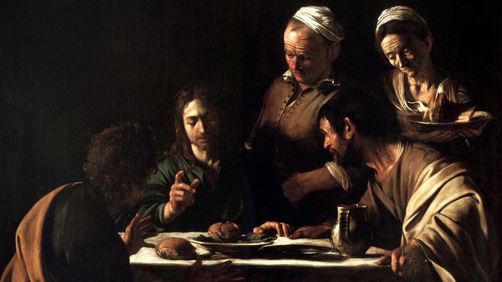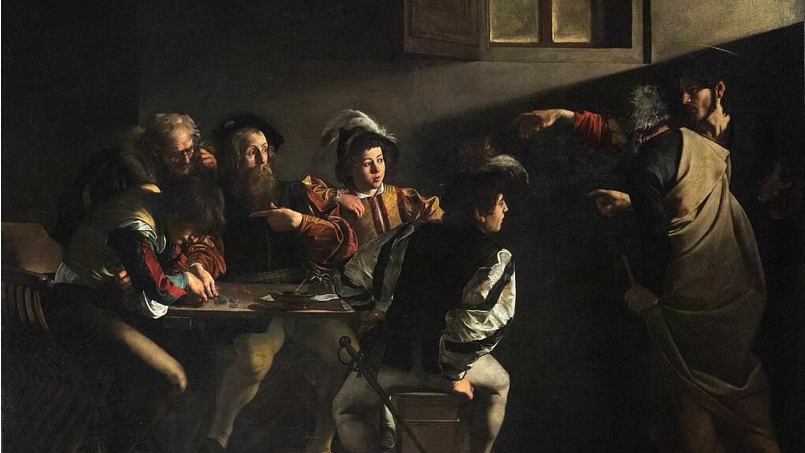 Aziz Matta’nın Çağrılışı tablosunda da Caravaggio’nun ışığı nasıl bir anlatı aracına dönüştürdüğü açıkça görülür. Loş bir meyhanede, masanın etrafında oturan beş adam solda toplanmışken, sağ kapıdan İsa ve Petrus içeri girer. İsa, sağdan sola doğru uzanan koluyla Matta’yı işaret eder; Petrus ise onun hemen önünde yer alır. Solda, masanın başında oturan figürlerden biri olan Matta, İsa’nın içeri girdiğinin farkında bile olmadan başını öne eğmiş, masadaki paralarıyla meşguldür. İşte tam bu anda sağdan gelen ışık huzmesi, İsa’nın parmağıyla aynı yönde ilerleyerek Matta’nın yüzünü aydınlatır.