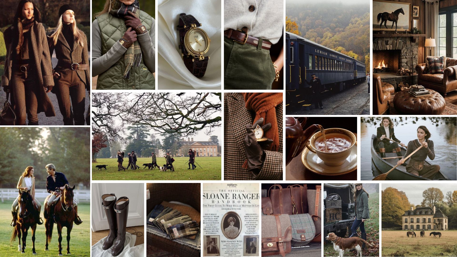 Oxford yaka gömlekler, kaşe blazer’lar, binici pantolonları, maxi etekler, askeri montlar ve kaşmir süveterler bu stilin temel parçalarıdır. Ekose desenli çantalar ve fularların modern havasını, deri çizme ve eldivenlerle kombinleyerek tertipli ve nostaljik bir görünüm yakalayabilirsiniz. Saçlarınızın ve makyajınızın doğal tarzda olması, stilinizi kırsal ortamla uyumlu hâle getirerek konforlu hissetmenizi sağlar. Kulüp toplantılarında veya etkinliklerinde Hermès, Burberry ve Burbour‘ dan tercih edeceğiniz ipek eşarplar, zarif inci küpeler, klasik bir saat ya da üst kalite bir şemsiye ise abartısız ama karakterli bir dokunuş sunar.