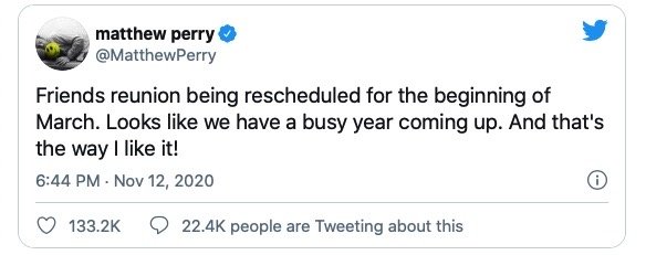 Matthew Perry tweet’inde; “Friends birleşmesi Mart’ın başı olarak planlandı. Görünen o ki önümüzdeki yıl bizi yoğun bir program bekliyor, tam da sevdiğim gibi!” dedi.