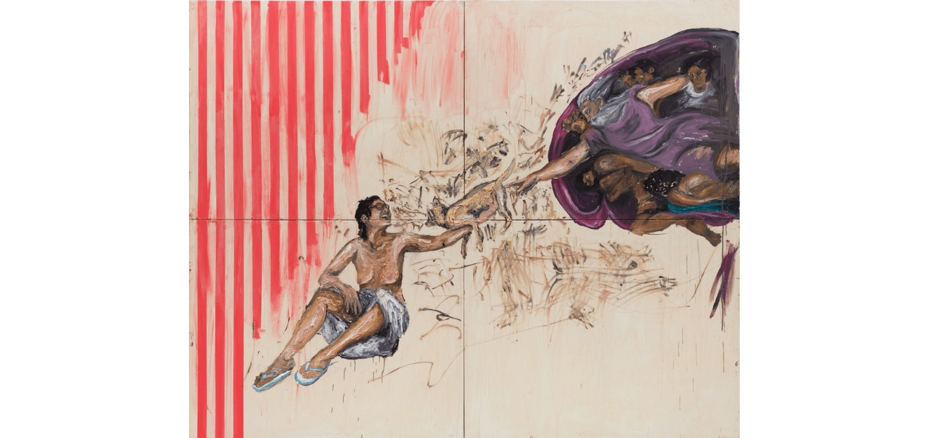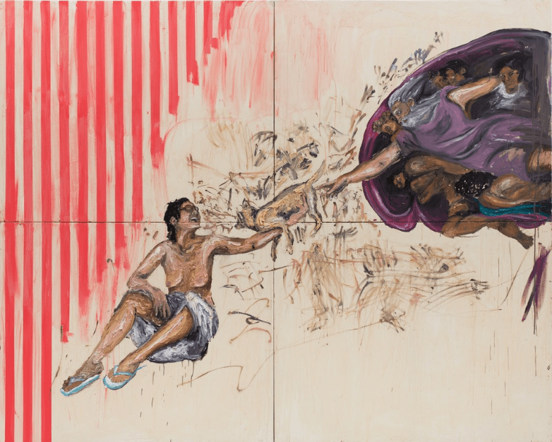 Kanonik eserlerin otoritelerini yıkmak amacıyla onların farklı versiyonlarını eleştirel bir tavırla yeniden ele alan çok sayıda sanatçı bulunur ve feminist sanat bağlamında da bu tarz eserlere sıklıkla rastlarız. Bunlardan biri, Brezilyalı sanatçı Camila Soato‘nun “Imundus e Abencoadas” adlı yukarıda gördüğünüz eseridir. Sanatçının, Katolik ikonografisini ve erkek egemen toplumu hicivsel bir açıdan ele aldığı çalışmalarından biri olan eserin, zaten ilk bakışta İtalyan ressam Michelangelo‘nun ünlü freski Creation of Adam (Adem’in Yaratılışı, 1511)’dan esinlenilerek oluşturulduğu aşikardır.