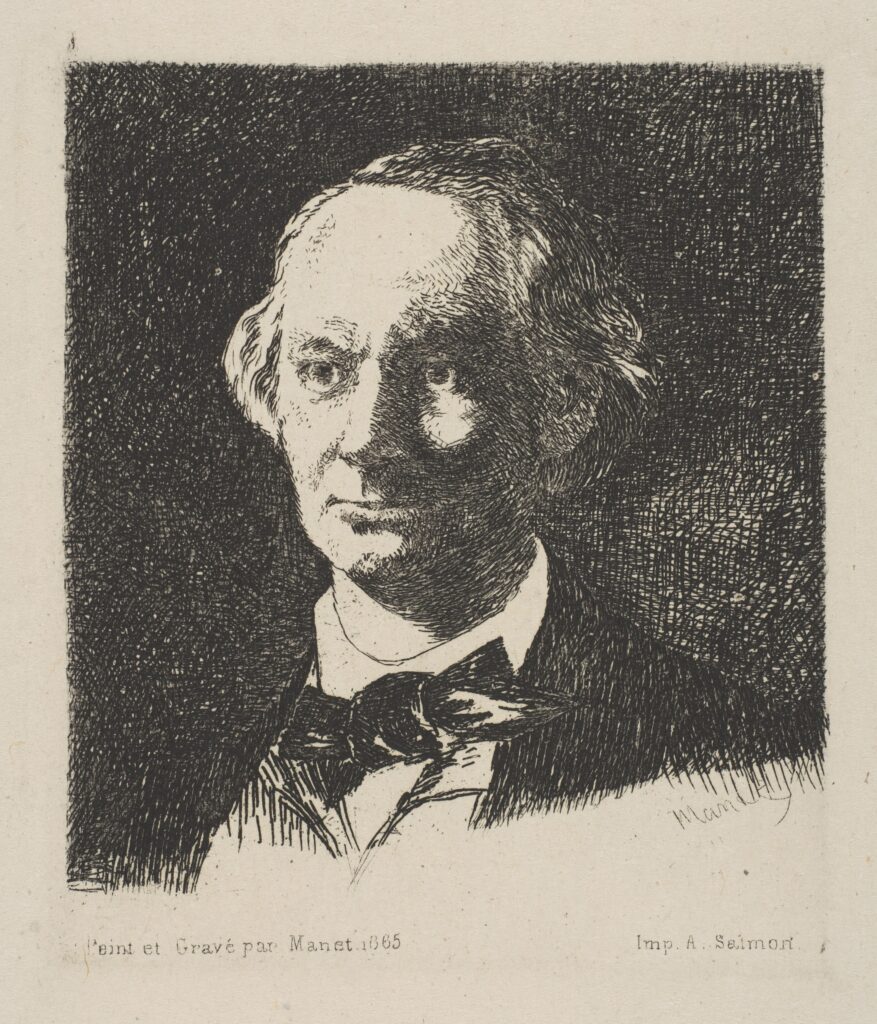 1855 civarında Manet, şair ve eleştirmen Charles Baudelaire ile yakın arkadaş oldu. Her gün Paris’in yeni bulvarlarında ve parklarında birlikte geziniyorlardı. Bu gezintilerde ortaya çıkan endüstriyel çağı, modern şehir hayatının heyecanını ve sanatçının onu tasvir etme sorumluluğunu tartışıyorlardı. Manet bu eseri 1865 yılında, Baudelaire’in fotoğrafçı Nadar tarafından çekilen portre fotoğrafını referans alarak yapmıştır. Dokuma kağıdının üzerine yapılmış bir gravürdür.