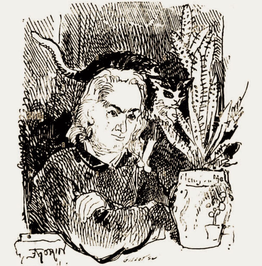 Morin tarafından çizilmiş Baudelaire ve kedisi pencereden dışarıyı izlemektedir. Morin bu çizimi Champfleury’nin Les Chats’inde yayınlanan bir eskizinden esinlenerek yapmıştır. Baudelaire gerçekten de bir kedi insanı, birçok şiirinde kedilere yer verdiği gibi, özellikle kediler için yazılmış şiirleri de var. Kötülük Çiçekleri isimli şiir kitabında “Kedi” ve “Kediler” adıyla üç tane şiiri bulunmakta.
