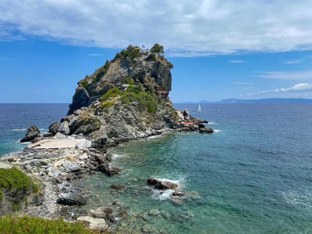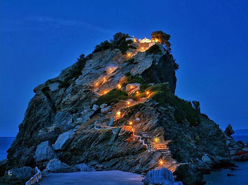 Adaya ulaşmak kolay değil: önce Atina ya da Selanik‘ten kara yoluyla Volos limanına, oradan feribotla Skopelos‘a geçiliyor. Ama belki de bu erişilmesi görece zor oluş, onun güzelliğini korumasının en büyük sebebi.