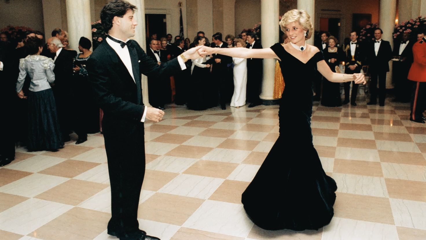 Prenses Diana’nın 1985’te Beyaz Saray’da John Travolta ile dans ederken giydiği lacivert kadife elbise, zarafet ve şıklığın simgesidir. Victor Edelstein tarafından tasarlanan, omuzları açık, uzun elbiseyi ilk olarak bordo renkte gören Diana, elbisenin gece için özel olarak gece mavisi rengiyle yeniden tasarlanmasını istedi. Elbise, Diana’nın ünlü safir ve inci kolyesiyle bütünleşerek, Travolta ile dans ederken muhteşem bir görüntü sergilemesine olanak sağladı. Bu dans, elbiseye Travolta Elbisesi lakabını kazandırdı ve Diana’nın hem genç yaşına uygun bir enerji yaymasını hem de kraliyet ailesinin geleneksel duruşunu modernleştirmesini sağladı. Elbise, daha sonra yapılan bir açık artırmada rekor bir fiyata satılarak, İngiliz bir iş adamı tarafından Diana hayranı olan eşine hediye edilmiştir.