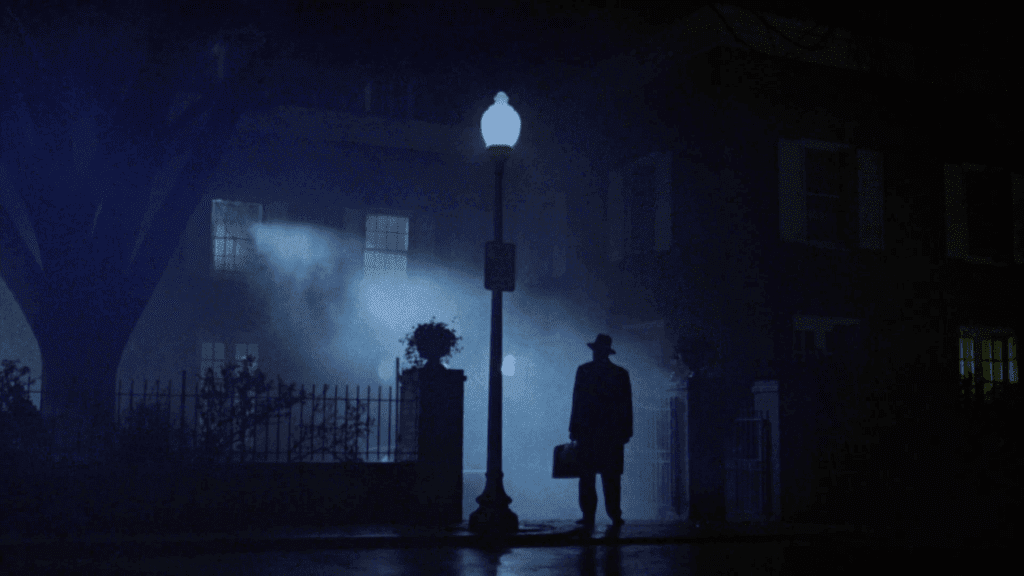 William Friedkin’in The Exorcist filminde Lankester Merrin’in gelişi olaylar için bir dönüm noktasıdır. Peder gece gelir ve bir an için şeytan çıkarma ayinini yapacağı evin önünde, çok tanıdık bir sokak lambasının yanında durur. Aslında, bu elektrik direği ve ortam, aynı olmasa da, Magritte’in, Işık İmparatorluğu (The Empire of Light) tablosuna çok benzer. René Magritte’nin ele aldığı bu tablo renklerde gerçek bir tezat oluşturarak; aydınlığa ve karanlığa, geceye ve gündüze karşı çıkarak onları bir arada yaşatıyor. Resmin karanlık kısmında tek ışık kaynağı sokak lambası ve penceredir. Bunlar umut kaynağı olduğu kadar tek umut işaretleri gibi görünüyordu. Karanlığın ve ışığın bir arada bulunması, tabloda resmedilişinin yanında filmin sonunda vermek istediği mesajı ulaştırmakta bir yansıtıcı olarak kullanıldı.