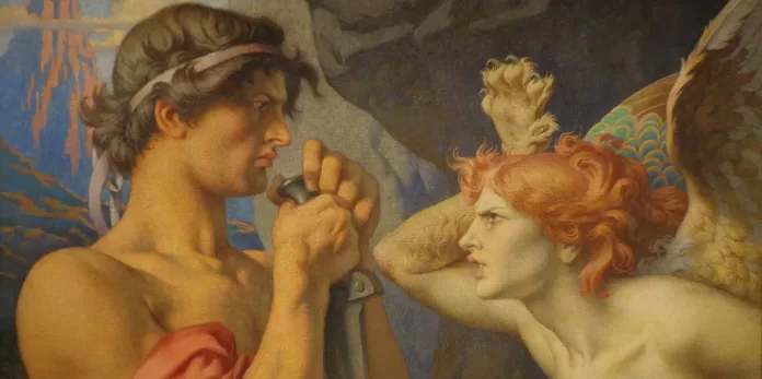Ünlü ressam Jacques-Louis David‘in öğrencisi olan Fabre, Oidipus’un Sfenks ile yüzleştiği bu çarpıcı anı ölümsüzleştiren sanatçılar arasında yer almaktadır. Fransız Ressam, Oidipus ile Sfenks’i muazzam bir Neoklasik doğa manzarasında resmetti ve ayrıca Oidipus’a güçlü bir Yunan kahraman tasviri bahşetti. Ingres’in Oidipus’undaki gibi düşünceli düşünceli bakmamaktadır bu sefer bedbaht kralımız. Aksine, kendinden oldukça emindir. İkili, kendilerinden ayrılan odak nedeniyle, doğayla bir bütün olmuşlardır ve Sfenks’in suratında öfkeyle karışık bir hayret ifadesi bulunmaktadır. Parmaklarıyla “üç” yapmasından yola çıkarak, Oidipus belki de bilmeceyi çözdüğü sırada tasvir edilmiş olabilir.
