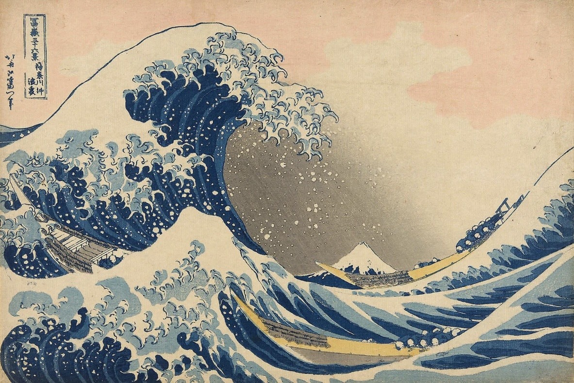 Prusya mavisinin Japonya’ya yeni getirildiği dönemde 70’li yaşlarında olan Hokusai, bu rengin derinliğiyle boyadığı dalganın ürkütücü gücünden, sonsuz yaşamla özdeşleştirilen Fuji Dağı’nın dinginliğine kadar işlediği her detayıyla doğanın yıkıcı gücü ile insan ruhunun kırılganlığını tek bir dalgada birleştirerek çaresiz direnişi simgelemektedir. 17. yüzyılın başlarında ahşap baskı eserlerini yalnızca ticari bir ürün olarak gören sanat tarihçilerine ve Japon halkının batı kültürüyle yasaklanan iletişimine rağmen Hokusai’nin yaratımından ilham alan sanatseverlerden biri de Yıldızlı Gece adlı eseriyle Van Gogh’tur.